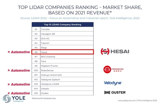 全球知名市场研究与战略咨询公司Yole Group旗下的Yole Intelligence公布的2021年激光雷达企业总营收排名来看,前5名都是工业与测绘领域供应商;在车载激光雷达领域,禾赛科技排名第1 (总排名第6),速腾聚创排名第2(总排名第10),Velodyne排名第3(总排名第13),Ouster排名第4(总排名第15)。